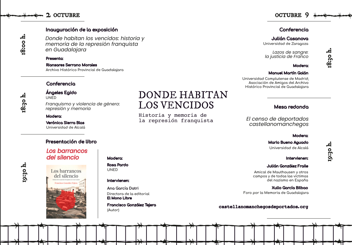 Además de las conferencias de los profesores/as Ángeles Egido y Julián Casanova, el ciclo incluye la inauguración y visita guiada a una exposición sobre los fondos documentales generados por la represión franquista en Guadalajara conservados en el Archivo Histórico Provincial de Guadalajara, la presentación del libro «Los barrancos del silencio», de Francisco González Tejera, recientemente publicado por la editorial El Mono Libre, y la presentación del censo de deportados castellanomanchegos elaborado por la Amical de Mauthausen y otros campos y de todas las víctimas del nazismo de España y el Foro por la Memoria de Guadalajara.